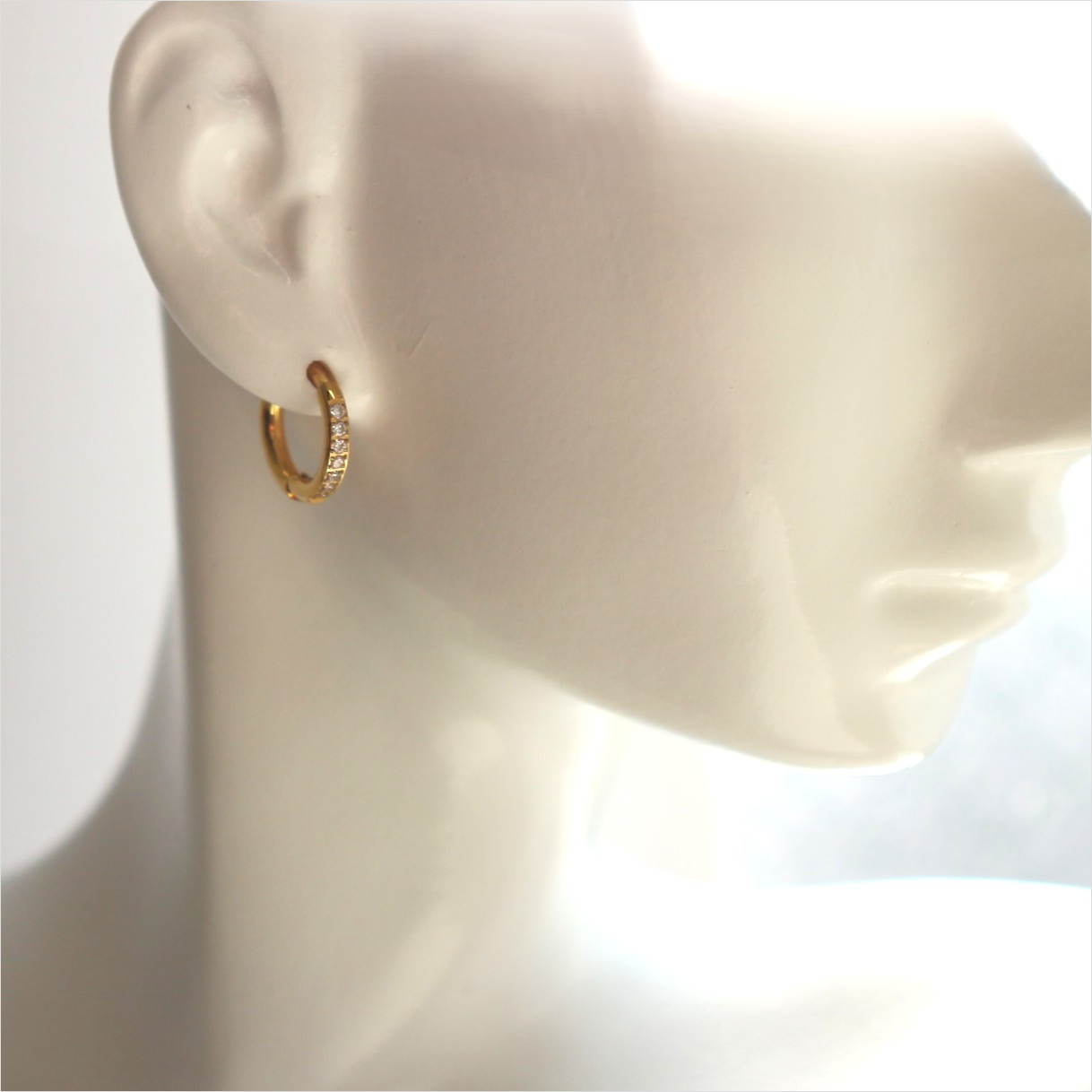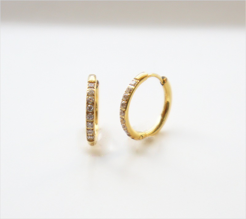 連なるビジューがポイントのフープピアス。