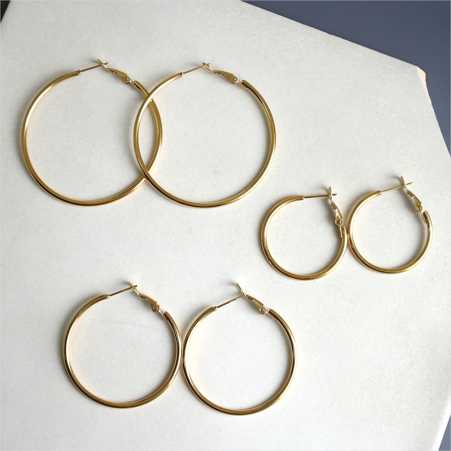 キャッチを落とす心配がないキャッチレスフープピアス。サイズによって見た目の印象が変わるので、サイズ違いで揃えてもOK。