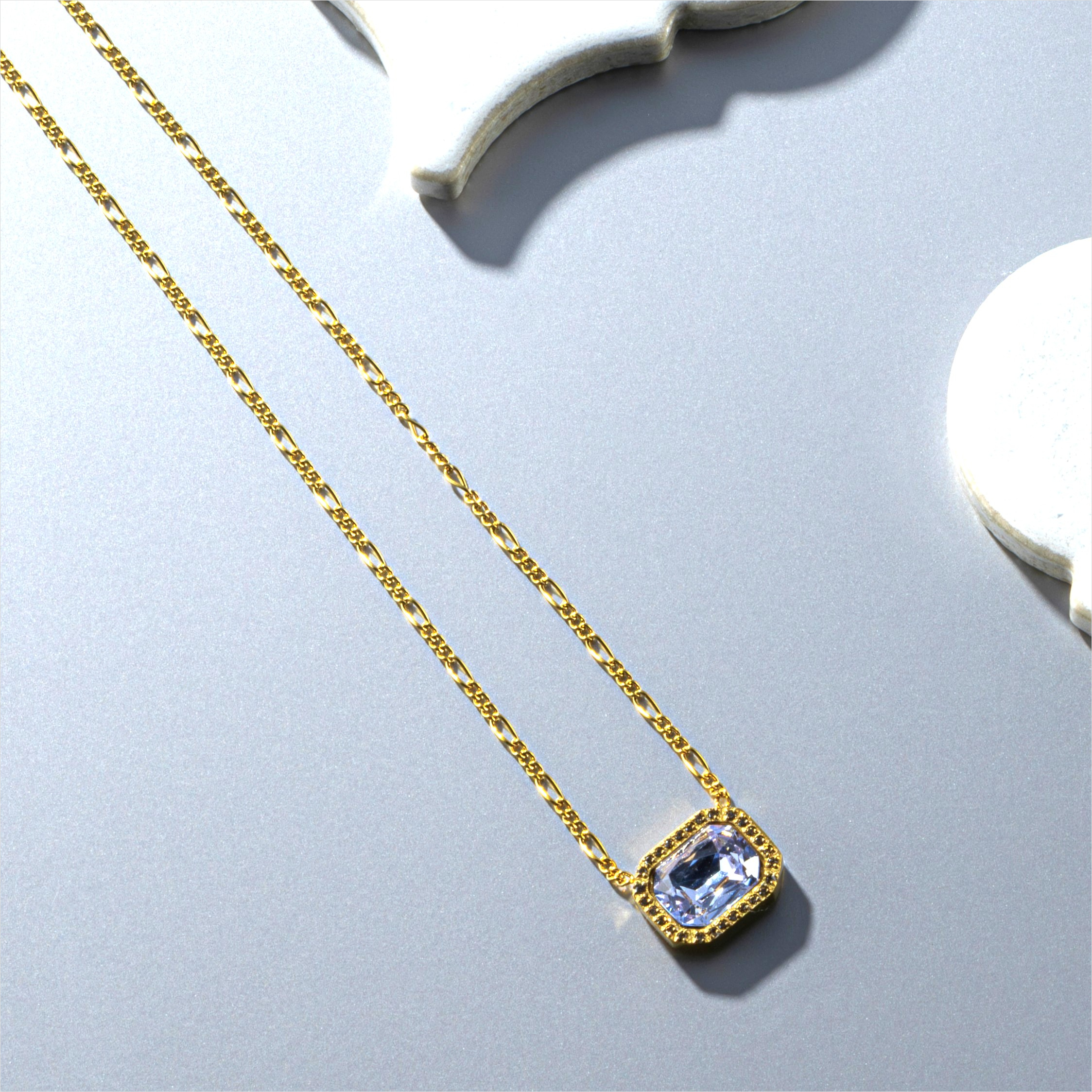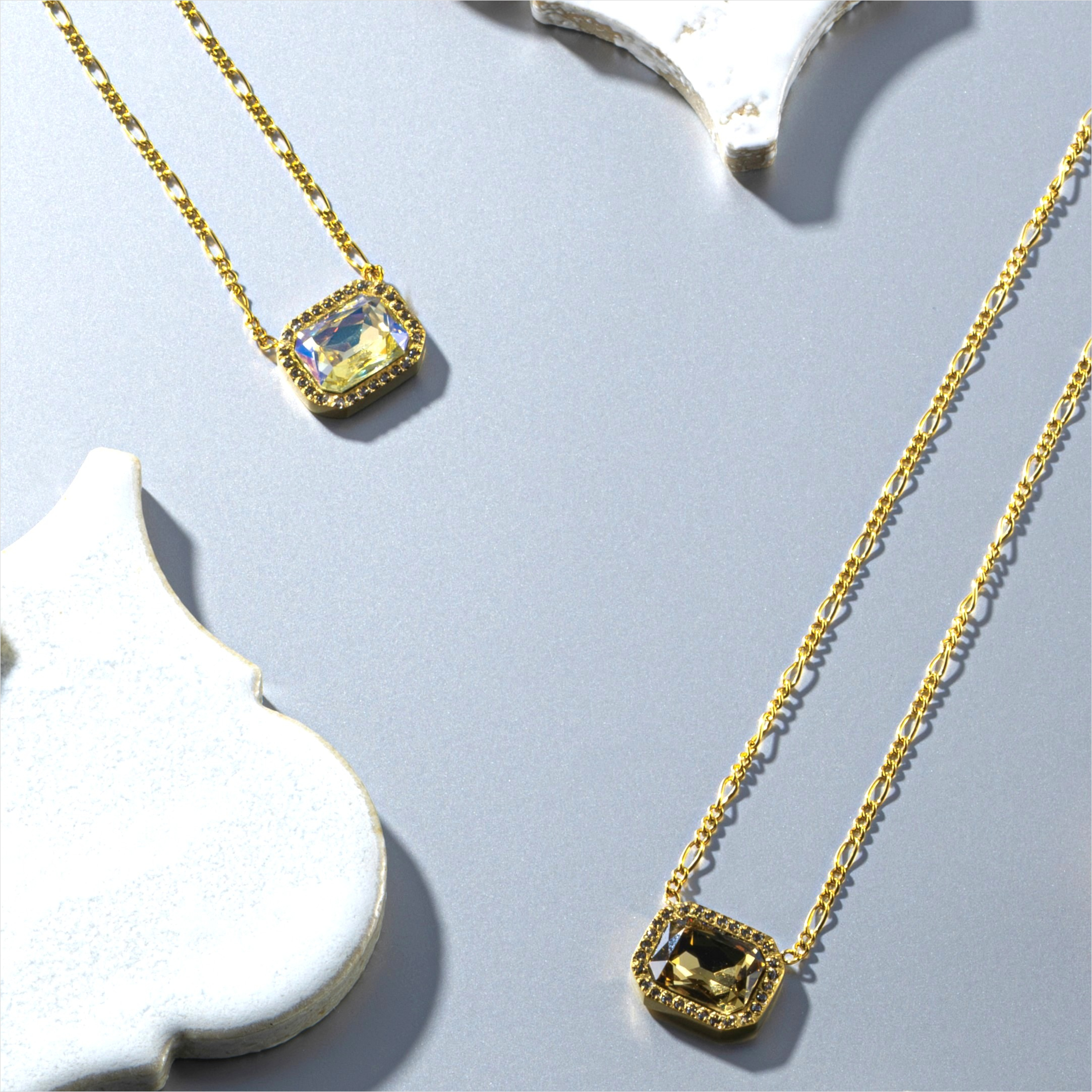 サイドの石をあえてブラックダイヤモンドカラーにした、モードな輝きを放つビジューネックレス。NEI/NORらしいエッジの効いた配色。同シリーズのピアスとのセット使いで、洗練された華やぎを添える高見えアクセサリー。