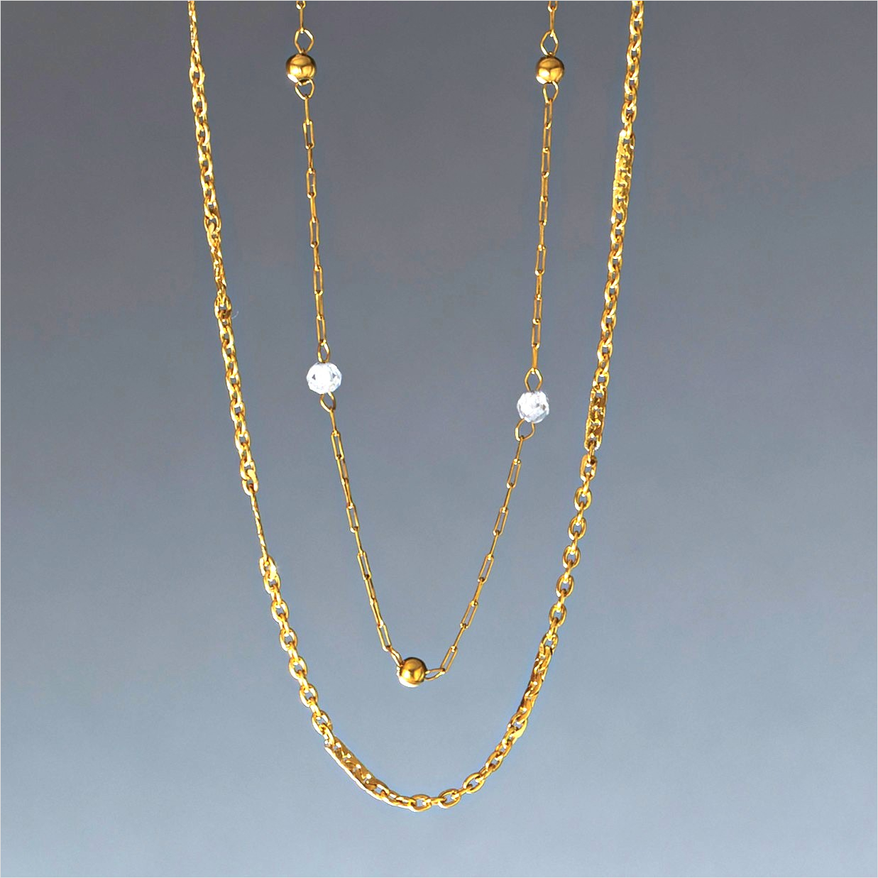 マルチカラーグラスとデザインあるチェーンとの2連ネックレス。これだけで首元を鮮やかに魅せてくれるジュエリー感溢れるネックレス。