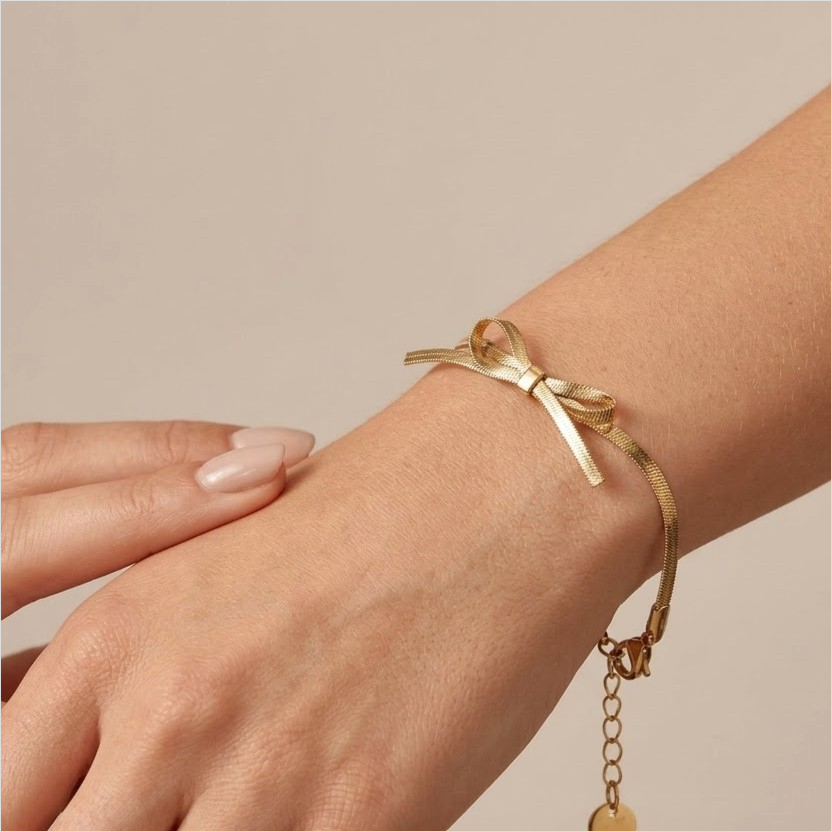 人気のリボンをモチーフにしたクールなブレスレット。※手作業で作られているため、左右のデザインに個体差があります。