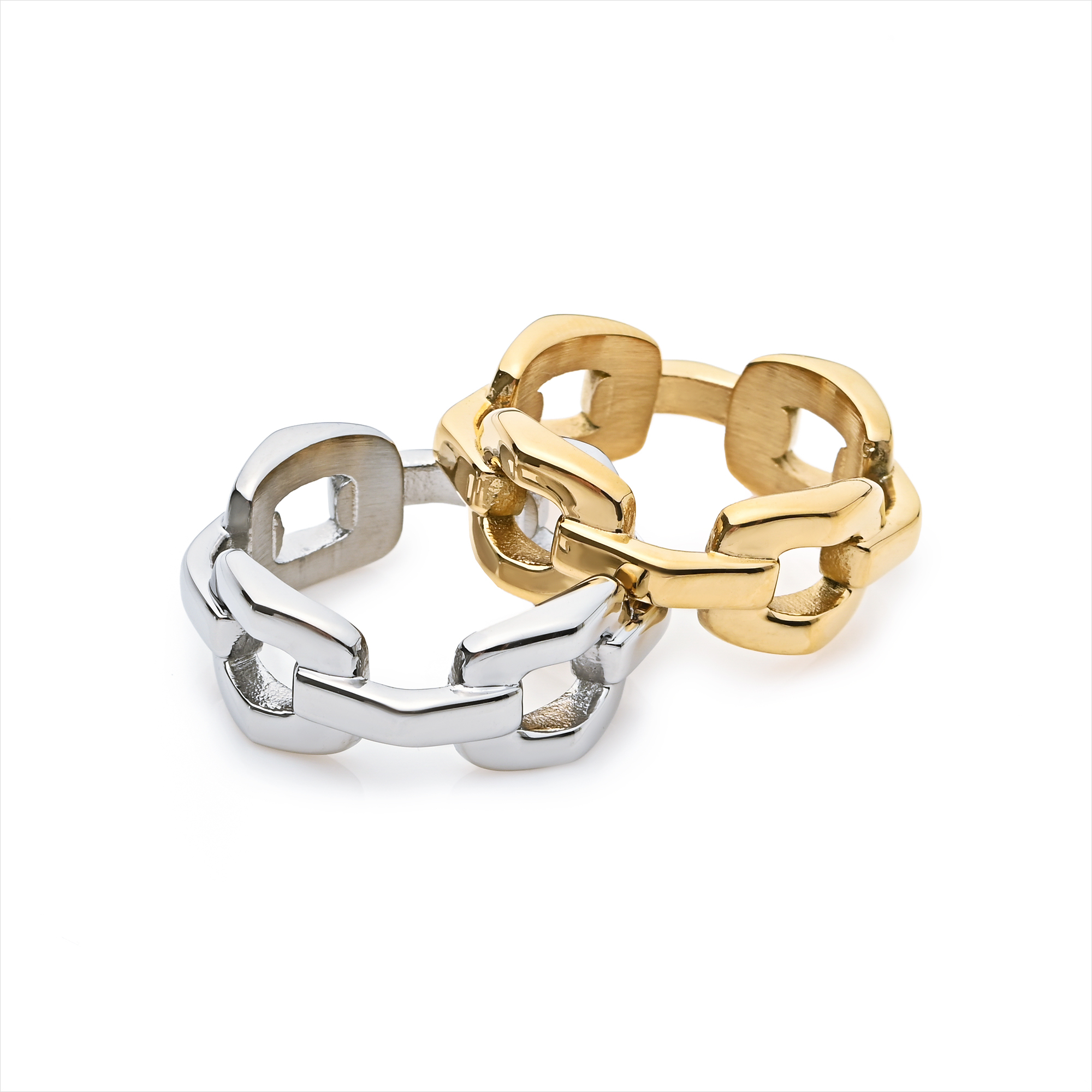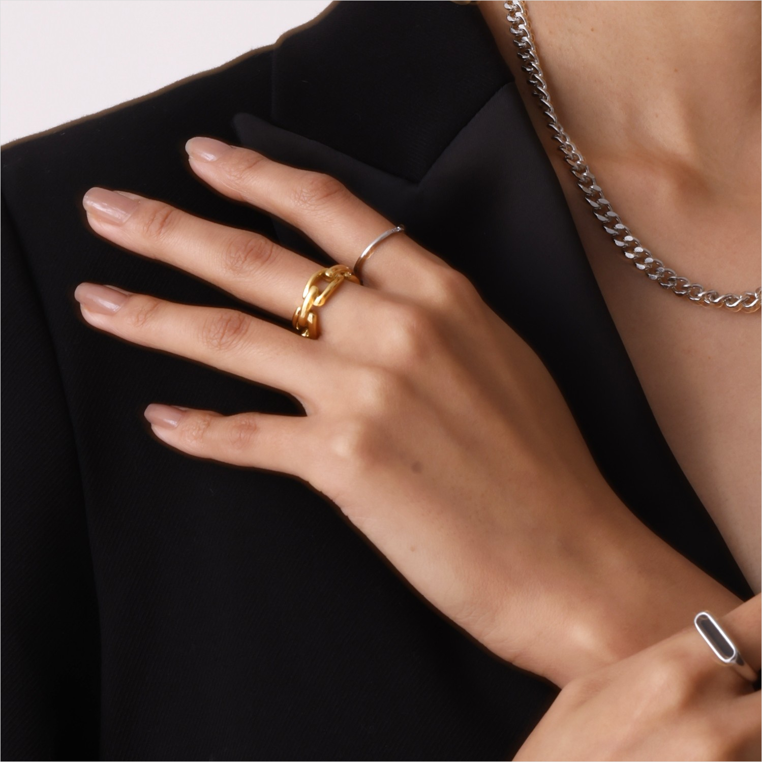 指先のポイントになるチェーンパターンのボリュームリング。