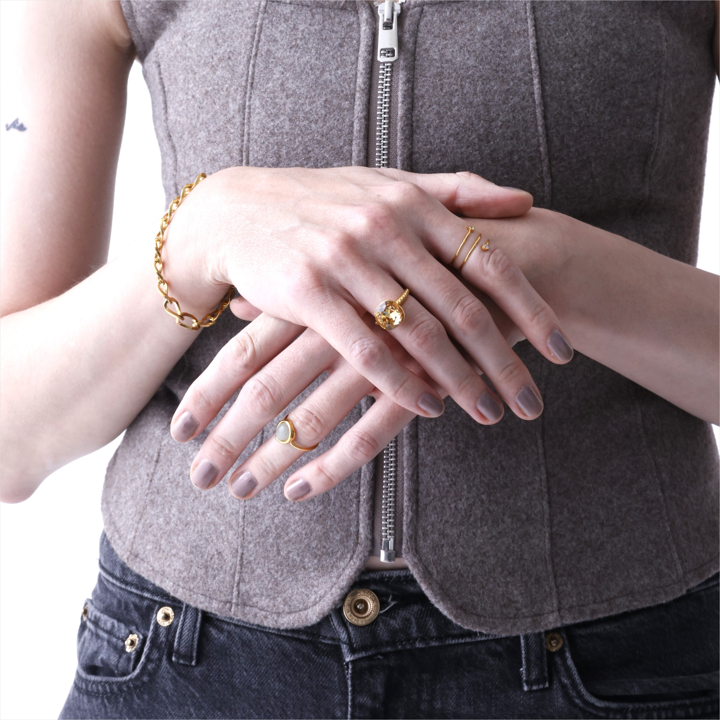 コーディネートのポイントになるカラークリスタルのビッグリング。NEI/NORらしい大人っぽくておしゃれなカラー3色をセレクト。リング台のデザインにもこだわったオリジナルリング。