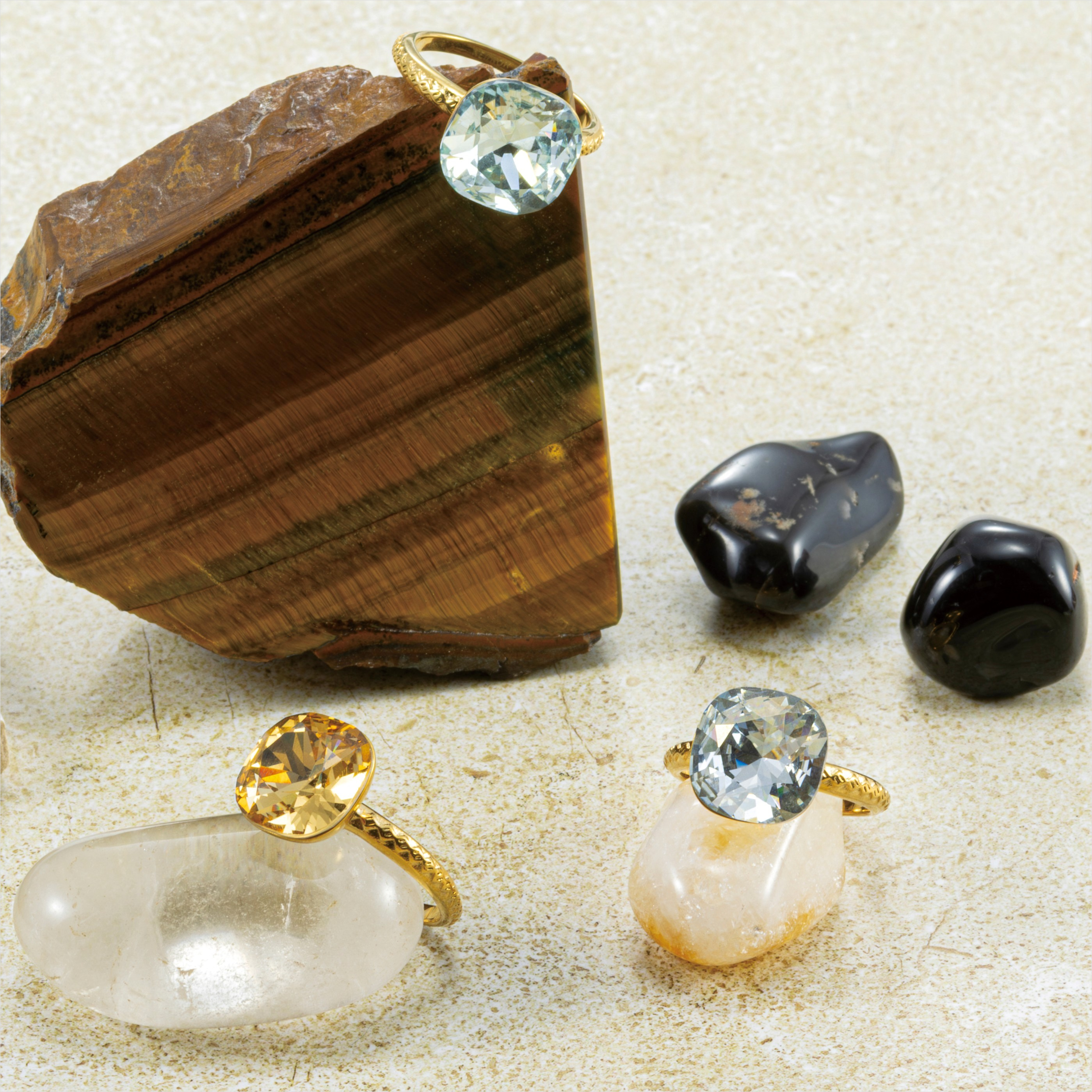 コーディネートの主役を飾る、カラークリスタルのビッグリング。